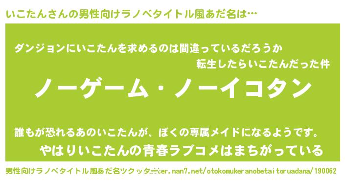 | 女子向けラノベタイトル風あだ名 | 『死神いこたんの再婚』 |