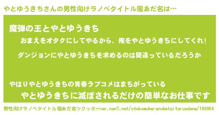 | 胡散臭い通販商品みたいなあだ名 | 『信頼と実績のサプリメント…その名も「やとゆうきち」』 |