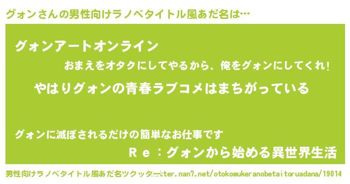 | 女子向けラノベタイトル風あだ名 | 『グォンの雑貨屋さん』『グォン恋絵巻』 |