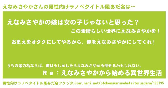 | 女子向けラノベタイトル風あだ名 | 『えなみさやか夫妻のなれそめ』 |