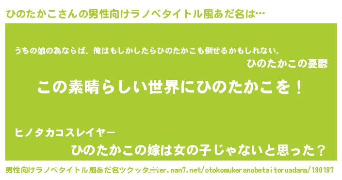 | 女子向けラノベタイトル風あだ名 | 『悪役ひのたかこに転生したようですが、知った事ではありません』 |