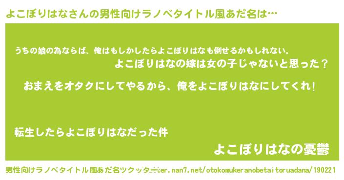 | 女子向けラノベタイトル風あだ名 | 『よこぼりはな夫妻のなれそめ』 |