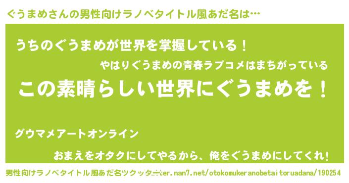 | 女子向けラノベタイトル風あだ名 | 『乙女ゲームの破滅フラグしかない悪役ぐうまめに転生してしまった…』 |