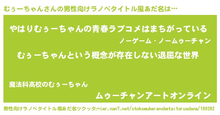 | 女子向けラノベタイトル風あだ名 | 『異世界で失敗しない100のむぅーちゃん』 |