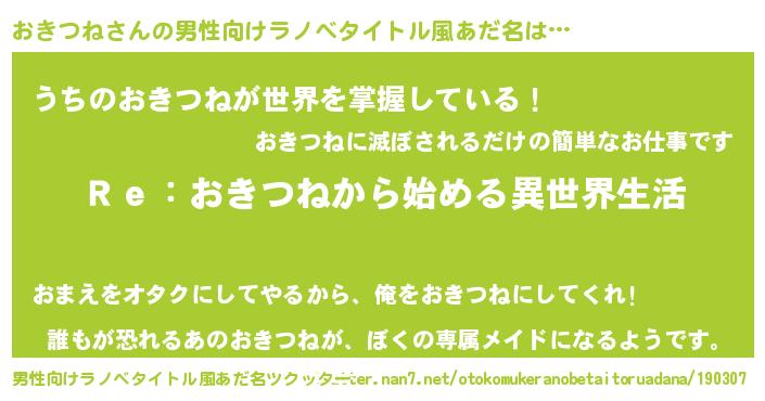 | 女子向けラノベタイトル風あだ名 | 『闇のおきつね』『おきつねの契約王妃』 |