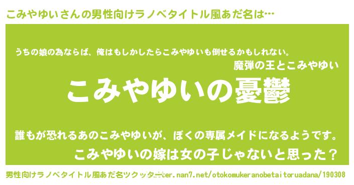 | 女子向けラノベタイトル風あだ名 | 『(仮)こみやゆいのやんごとなき事情』 |