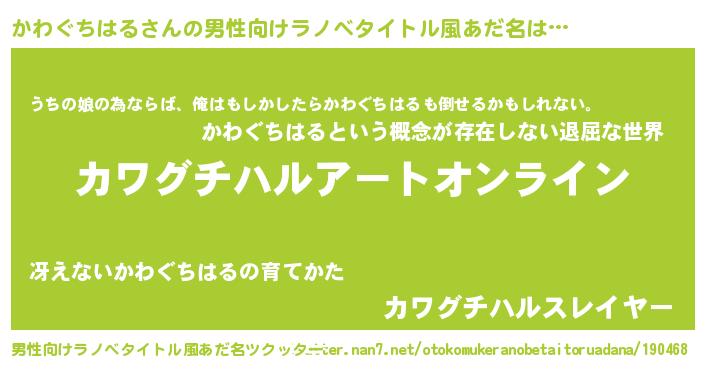 | 胡散臭い通販商品みたいなあだ名 | 『億万長者になれる霊験あらたかなお札…その名も「かわぐちはる」』 |