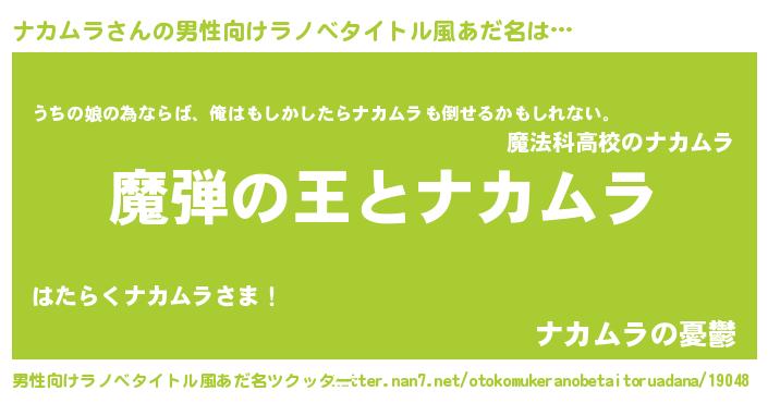 | 女子向けラノベタイトル風あだ名 | 『乙女ゲームの破滅フラグしかない悪役ナカムラに転生してしまった…』 |