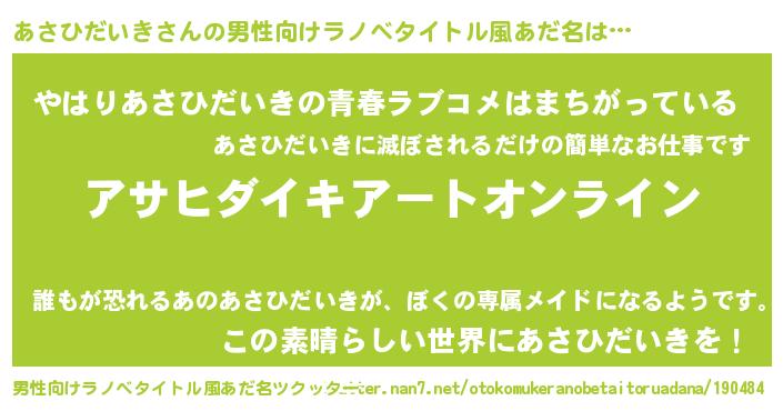 | 胡散臭い通販商品みたいなあだ名 | 『モテモテ間違いなし霊験あらたかなお札…その名も「あさひだいき」』 |