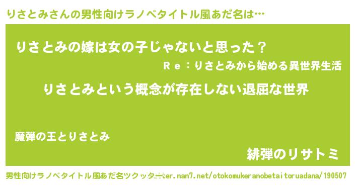 | 女子向けラノベタイトル風あだ名 | 『異世界で失敗しない100のりさとみ』 |