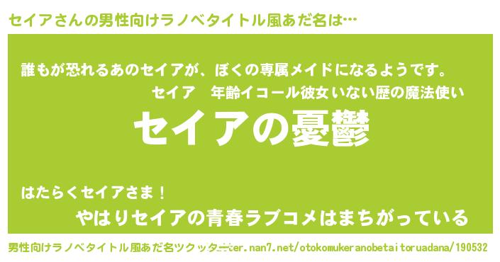 | 女子向けラノベタイトル風あだ名 | 『(仮)セイアのやんごとなき事情』 |
