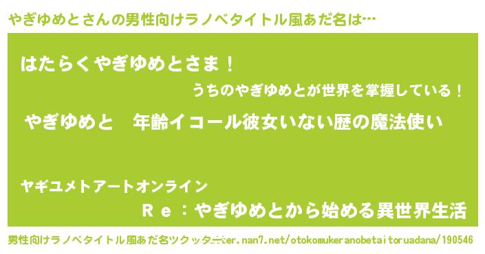 | 女子向けラノベタイトル風あだ名 | 『やぎゆめとの玉の輿計画!』 |