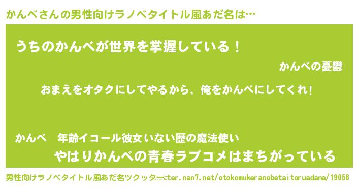 | 女子向けラノベタイトル風あだ名 | 『かんべ恋絵巻』『かんべの雑貨屋さん』 |