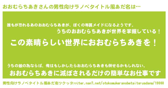 | 女子向けラノベタイトル風あだ名 | 『悪役おおむらちあきに転生したようですが、知った事ではありません』 |