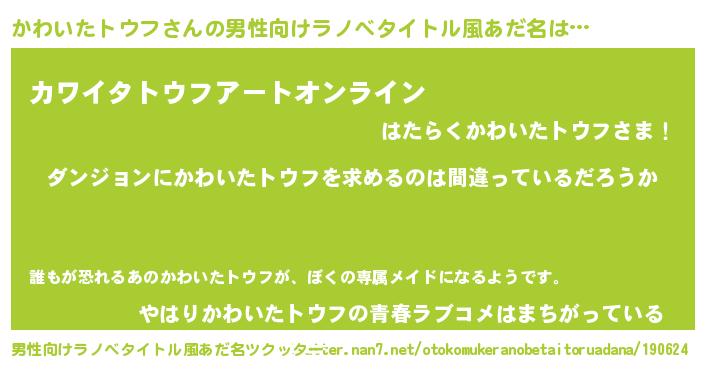 | 女子向けラノベタイトル風あだ名 | 『かわいたトウフは平凡を望む』 |