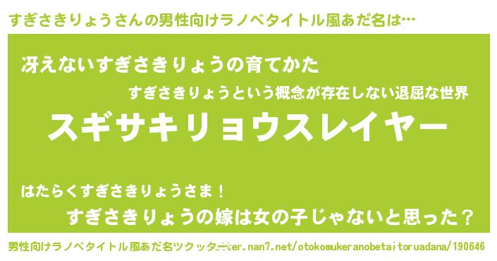 | 胡散臭い通販商品みたいなあだ名 | 『信頼と実績のサプリメント…その名も「すぎさきりょう」』 |