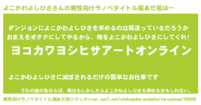 | 女子向けラノベタイトル風あだ名 | 『誰かこのよこかわよしひさを説明してください! ~契約から始まるウェディング~』 |