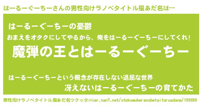 | 女子向けラノベタイトル風あだ名 | 『はーるーぐーちーが死なない童話 林檎のはーるーぐーちーの診療簿』 |