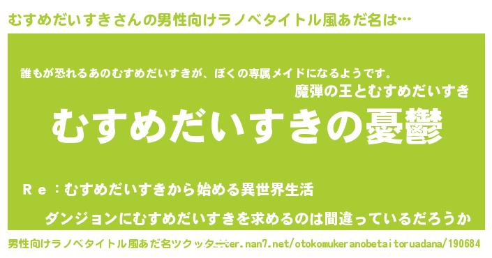 | 女子向けラノベタイトル風あだ名 | 『(仮)むすめだいすきのやんごとなき事情』 |