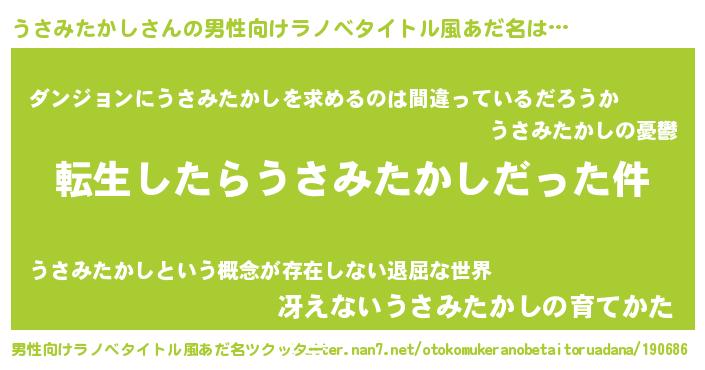 | 女子向けラノベタイトル風あだ名 | 『婚約破棄系悪役うさみたかしに転生したので、保身に走りました。』 |