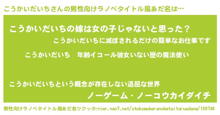 | 女子向けラノベタイトル風あだ名 | 『こうかいだいちの玉の輿計画!』 |
