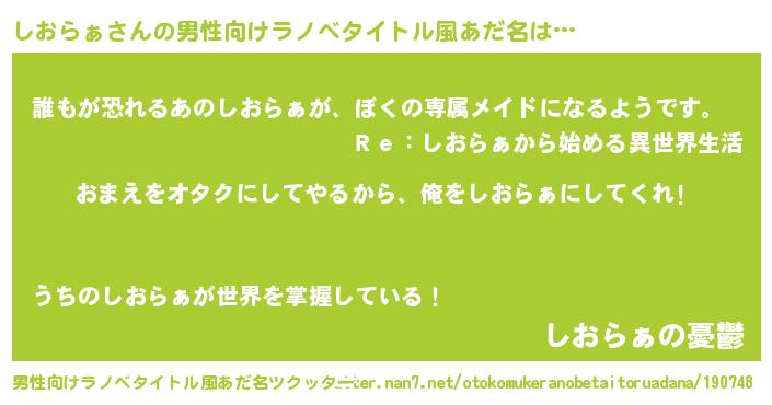 | 女子向けラノベタイトル風あだ名 | 『しおらぁ夫妻のなれそめ』 |