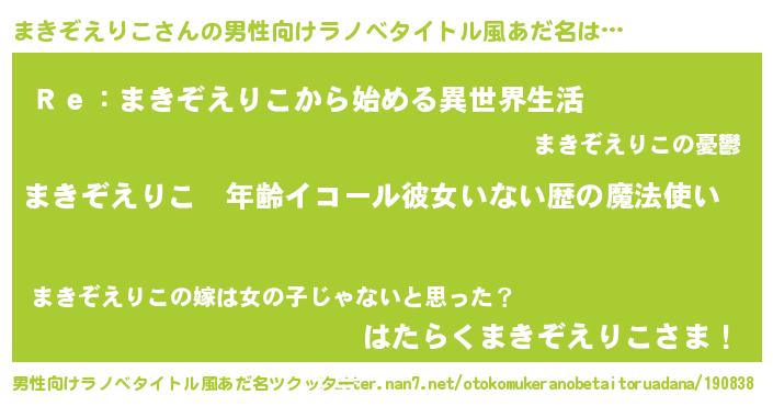 | 女子向けラノベタイトル風あだ名 | 『まきぞえりこの玉の輿計画!』 |