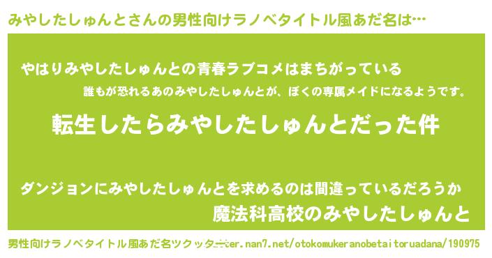 | 女子向けラノベタイトル風あだ名 | 『みやしたしゅんとの玉の輿計画!』 |