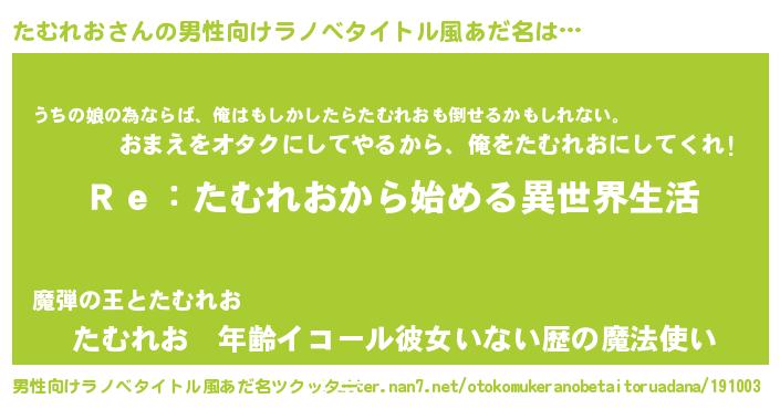 | 女子向けラノベタイトル風あだ名 | 『闇のたむれお』『たむれお伯爵の花嫁』 |