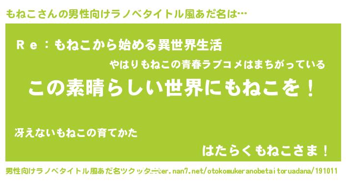 | 女子向けラノベタイトル風あだ名 | 『悪役もねこに転生したようですが、知った事ではありません』 |