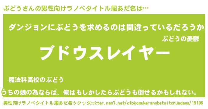 | 女子向けラノベタイトル風あだ名 | 『婚約破棄系悪役ぶどうに転生したので、保身に走りました。』 |