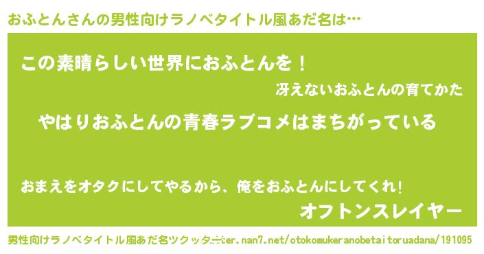 | 女子向けラノベタイトル風あだ名 | 『おふとんの雑貨屋さん』 |