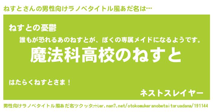 | 女子向けラノベタイトル風あだ名 | 『ねすとなんてお断りですっ。』 |