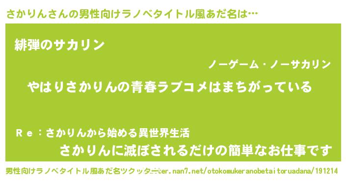| 女子向けラノベタイトル風あだ名 | 『さかりんの雑貨屋さん』『闇のさかりん』 |