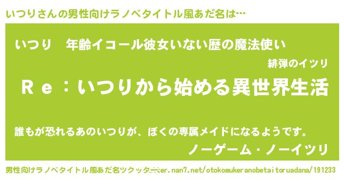 | 女子向けラノベタイトル風あだ名 | 『闇のいつり』『いつりの玉の輿計画!』 |