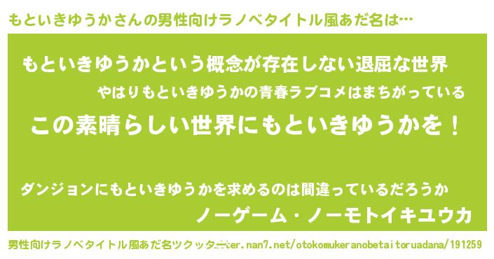| 胡散臭い通販商品みたいなあだ名 | 『あなたにだけ特別に提供する限定10本のレアな日本酒…その名も「もといきゆうか」』 |