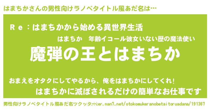 | 女子向けラノベタイトル風あだ名 | 『はまちかが死なない童話 林檎のはまちかの診療簿』 |