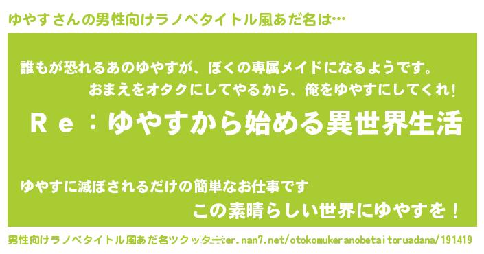 | 女子向けラノベタイトル風あだ名 | 『闇のゆやす』『ゆやすの契約王妃』 |