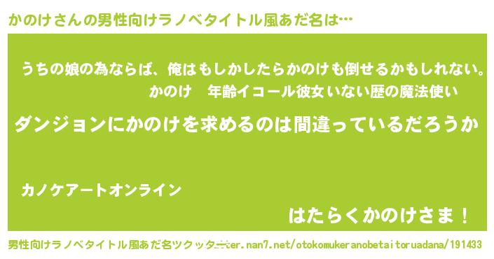 | 胡散臭い通販商品みたいなあだ名 | 『信頼と実績のサプリメント…その名も「かのけ」』 |