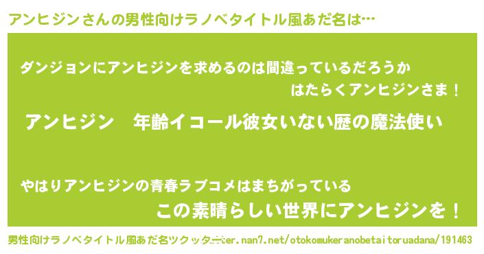 | 女子向けラノベタイトル風あだ名 | 『アンヒジンの玉の輿計画!』 |