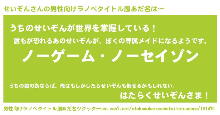 | 女子向けラノベタイトル風あだ名 | 『死神せいぞんの再婚』 |