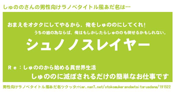 | ヒーロー風カッコイイあだ名 | 『正義の使者しゅのの』『仮面シュダー』 |