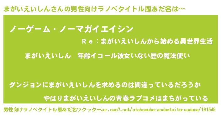 | 女子向けラノベタイトル風あだ名 | 『まがいえいしんの玉の輿計画!』 |