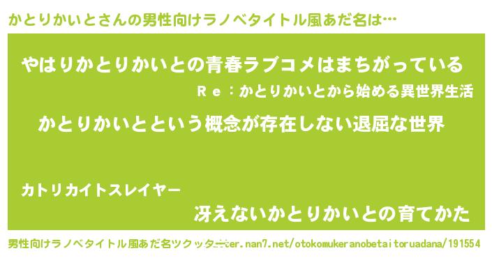| 女子向けラノベタイトル風あだ名 | 『異世界で失敗しない100のかとりかいと』 |
