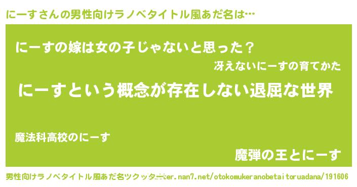 | 女子向けラノベタイトル風あだ名 | 『異世界で失敗しない100のにーす』 |