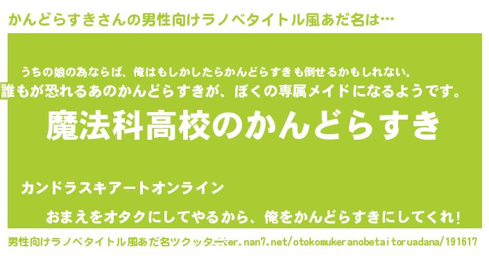 | 女子向けラノベタイトル風あだ名 | 『かんどらすきなんてお断りですっ。』 |