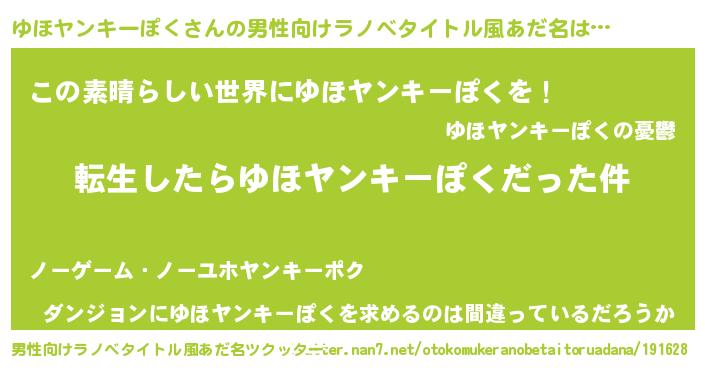 | 女子向けラノベタイトル風あだ名 | 『ゆほヤンキーぽくの玉の輿計画!』 |