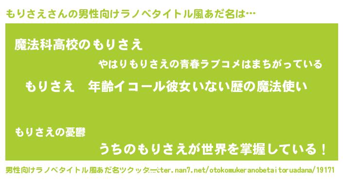 | 女子向けラノベタイトル風あだ名 | 『もりさえの玉の輿計画!』 |