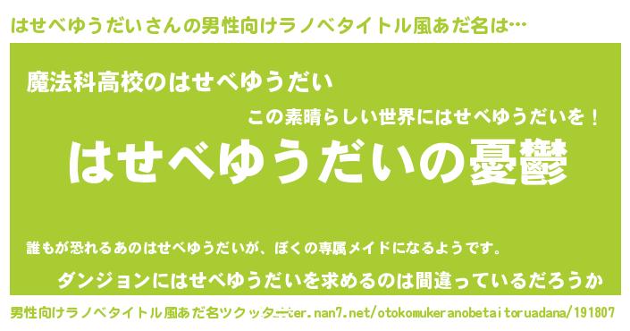 | 女子向けラノベタイトル風あだ名 | 『(仮)はせべゆうだいのやんごとなき事情』 |