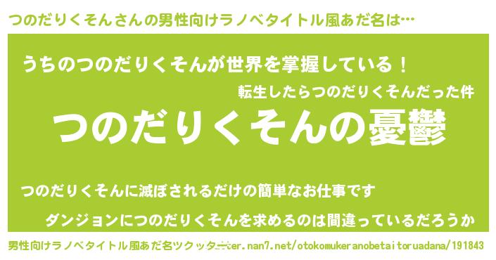 | 女子向けラノベタイトル風あだ名 | 『(仮)つのだりくそんのやんごとなき事情』 |